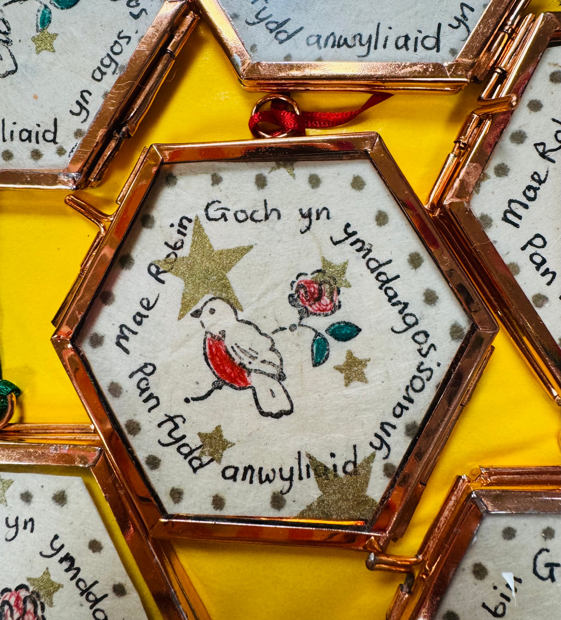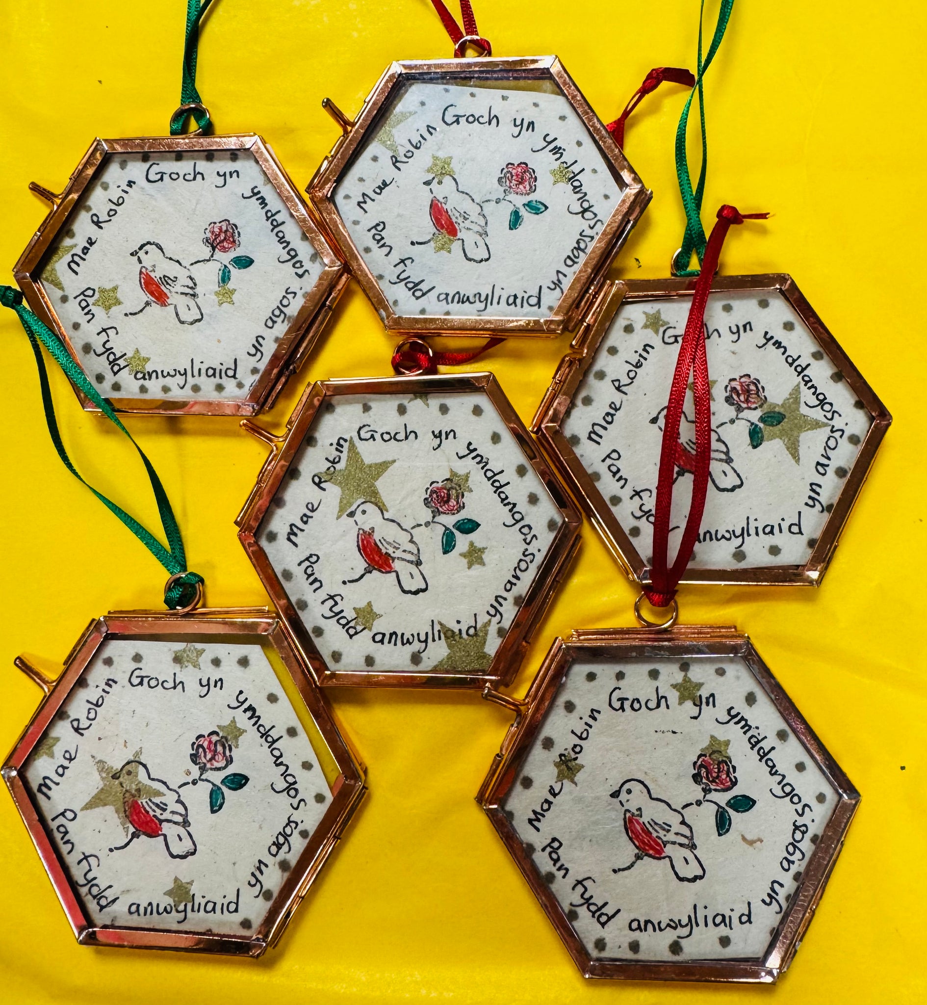 Ffrâm bach ‘Mae Robin Goch yn ymddangos pan fydd anwyliaid yn agos’ wedi eu gwneud â llaw / Handmade  ‘Mae Robin Goch yn ymddangos pan fydd anwyliaid yn agos’ small frame