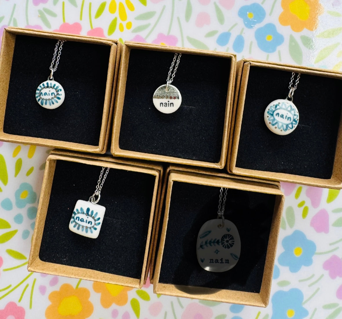 Mwclis unigryw ‘Nain’ seramig ac arian gan Tlysau / Unique seramic and silver ‘Nain’ necklace by Tlysau
