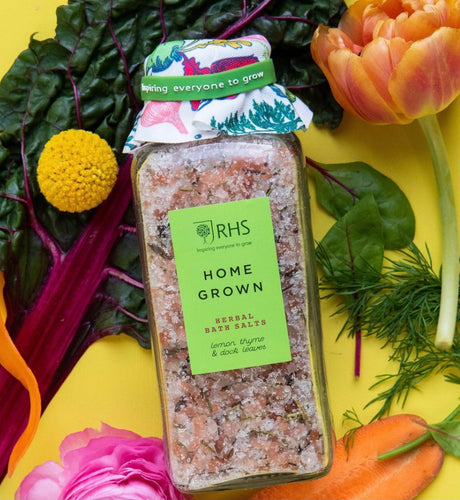 Halen bath Himyalayan ymlaciol ‘RHS Home Grown’ mewn jar wydr / RHS Home Grown Relaxing Himylayan herbal bath salts in glass jar