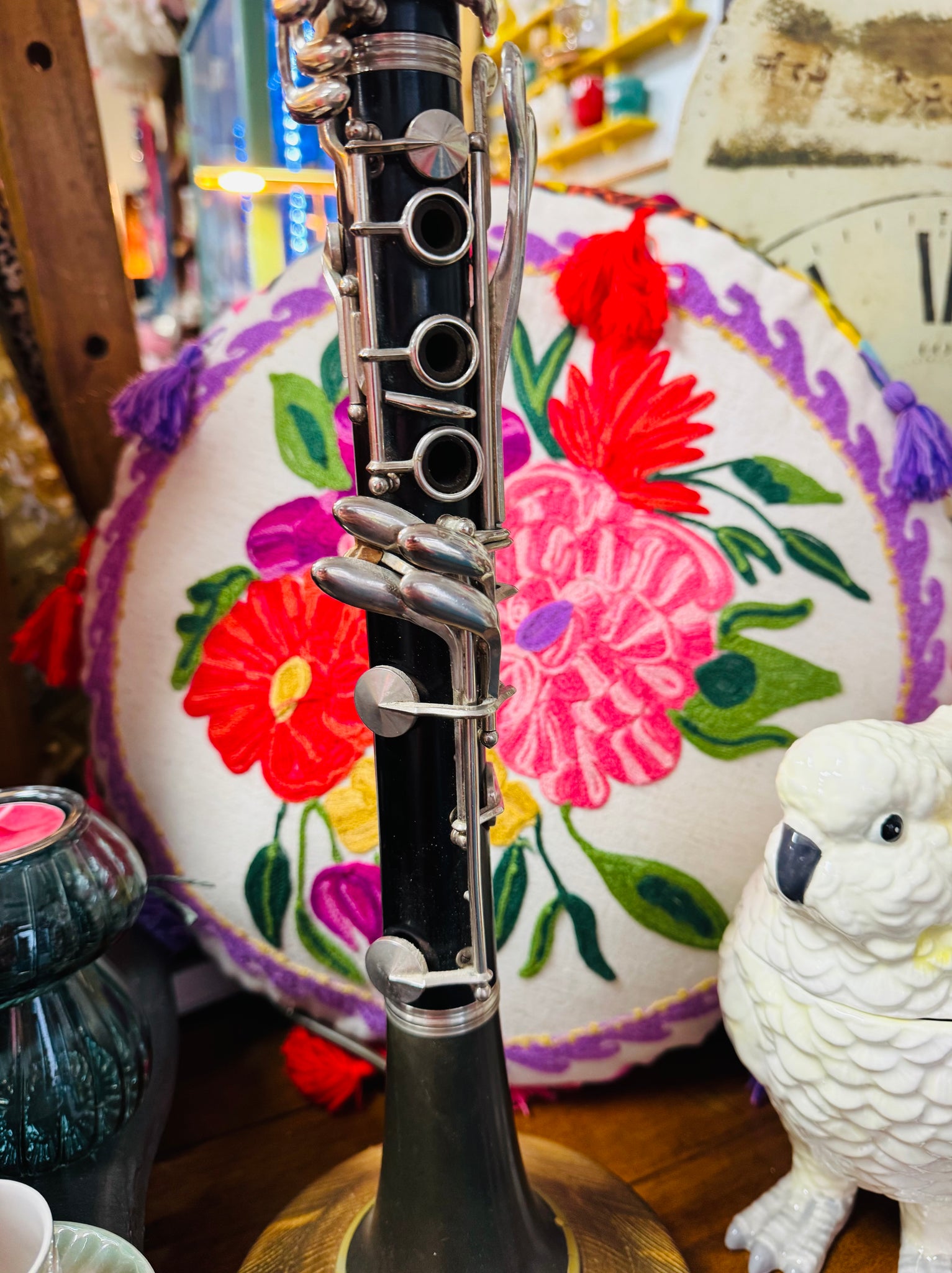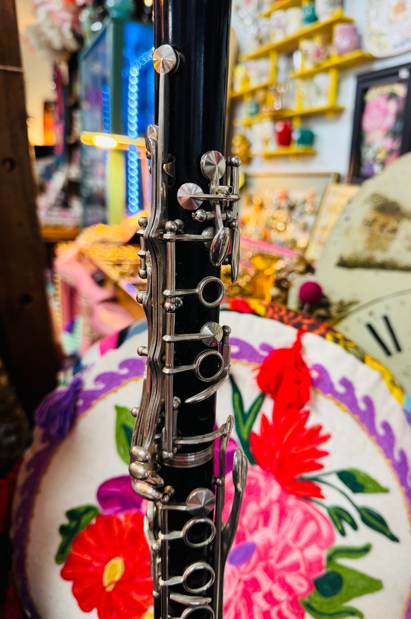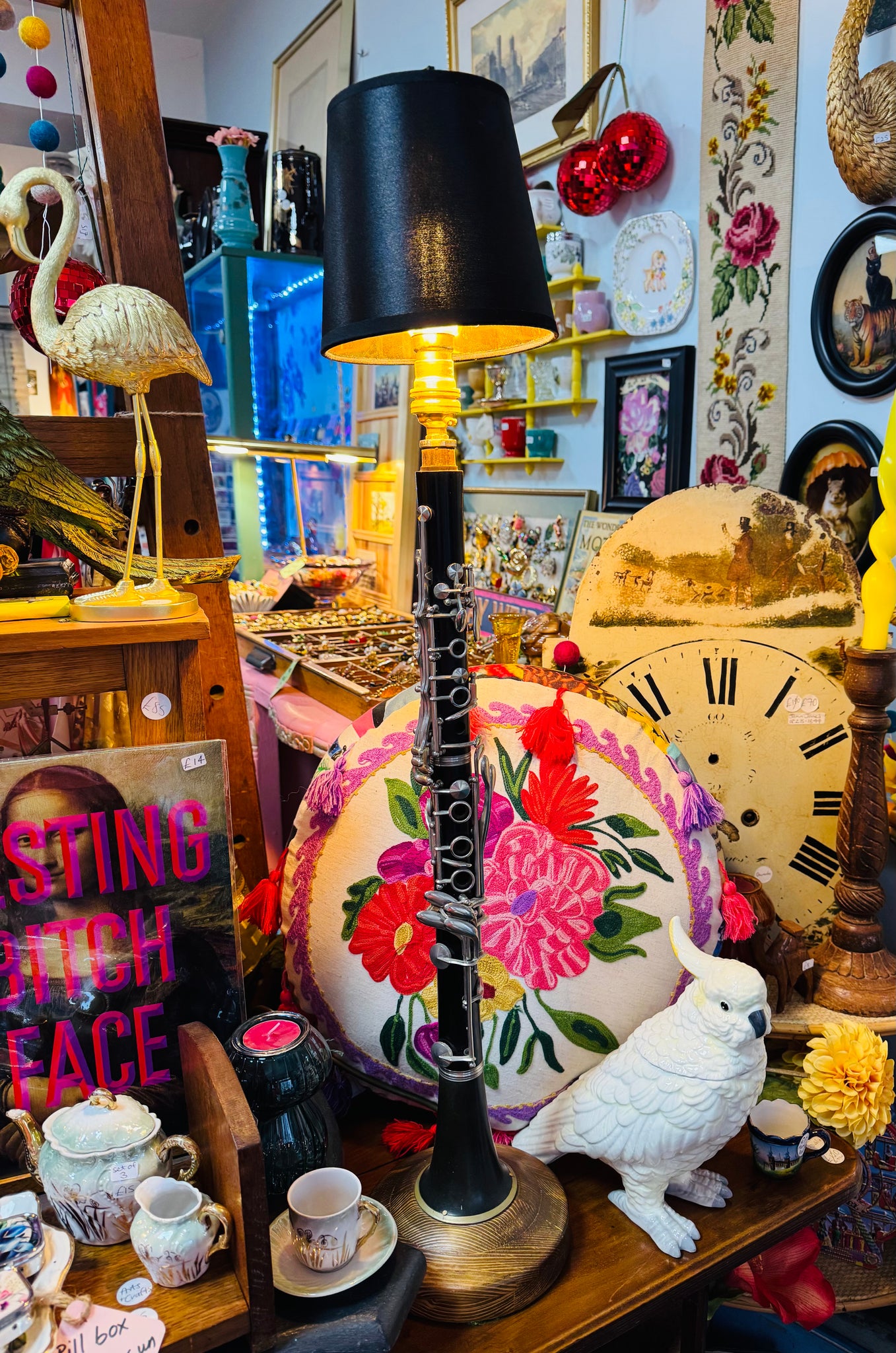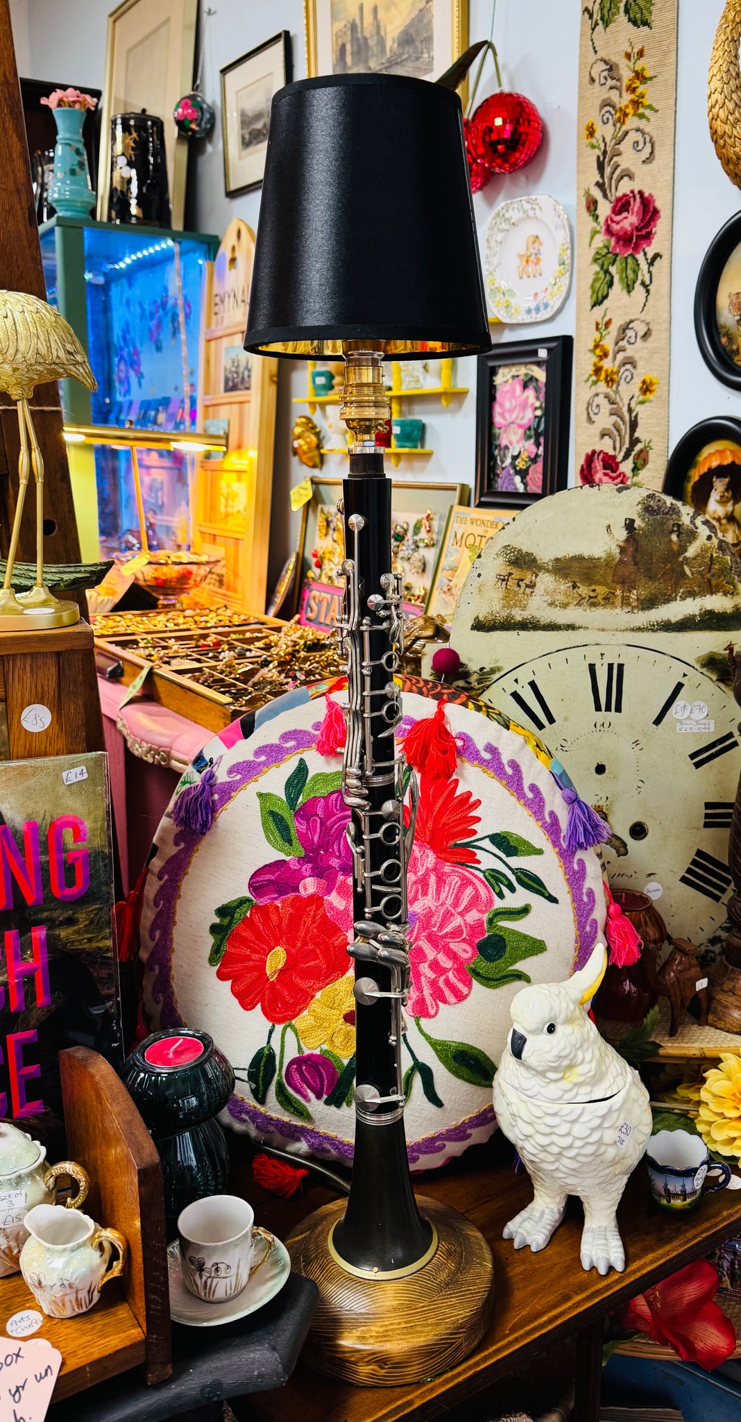 Golau unigryw allan o hen Glarinet ‘Corton’ ar waelod pren sydd wedi ei wneud â llaw / Unique light made out of an old ‘Corton’ Clarinet on a handmade wooden base