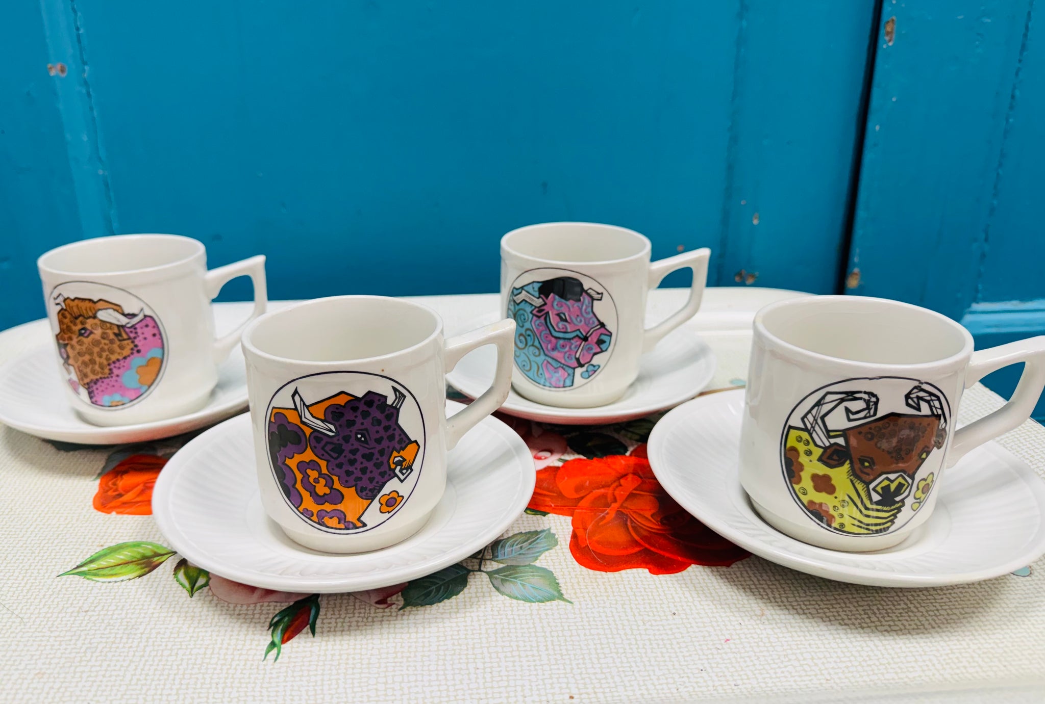 Cwpanau a soser Retro prin Beefeater dyluniau Tarw o’r 70au / Retro rare Beefeater 1970s bull design cup and saucers