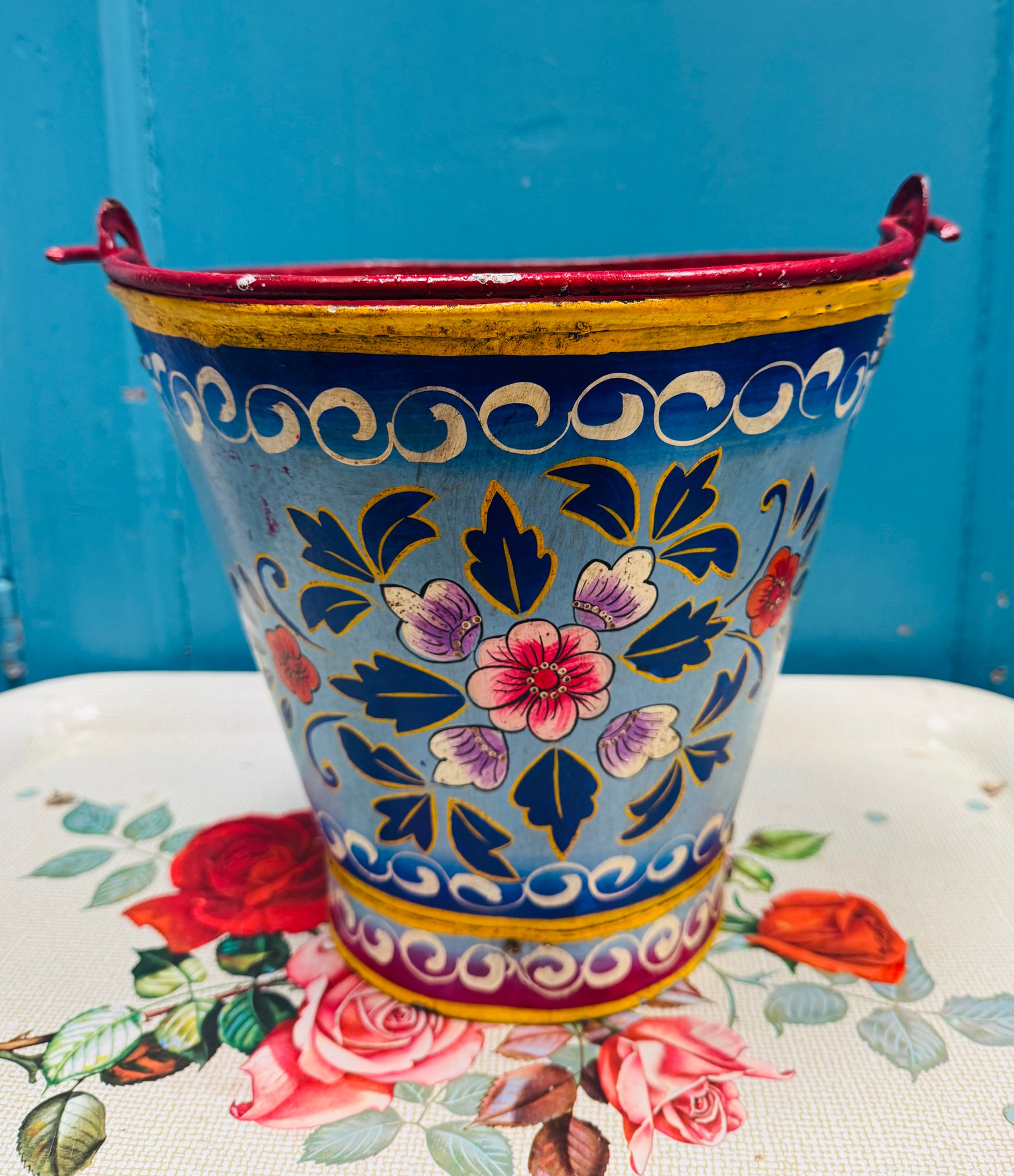 Bwced haearn Vintage wedi ei beintio â llaw (cefndir glas) / Vintage iron handpainted bucket (blue background)