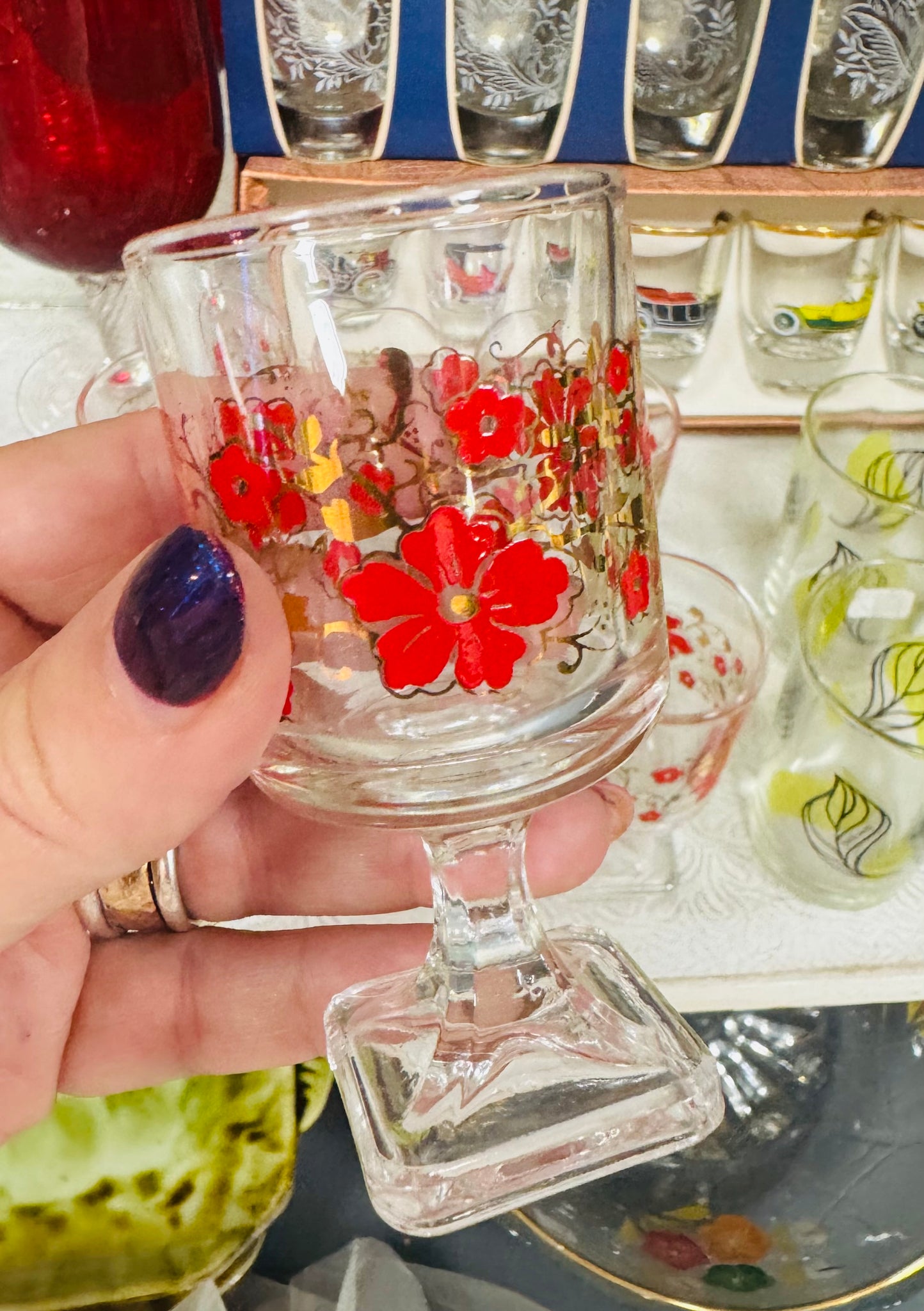 Set o 6 gwydryn blodeuog coch Retro sherry gyda gwaelod sgwâr / Set of 6 red floral Retro sherry glasses with square base