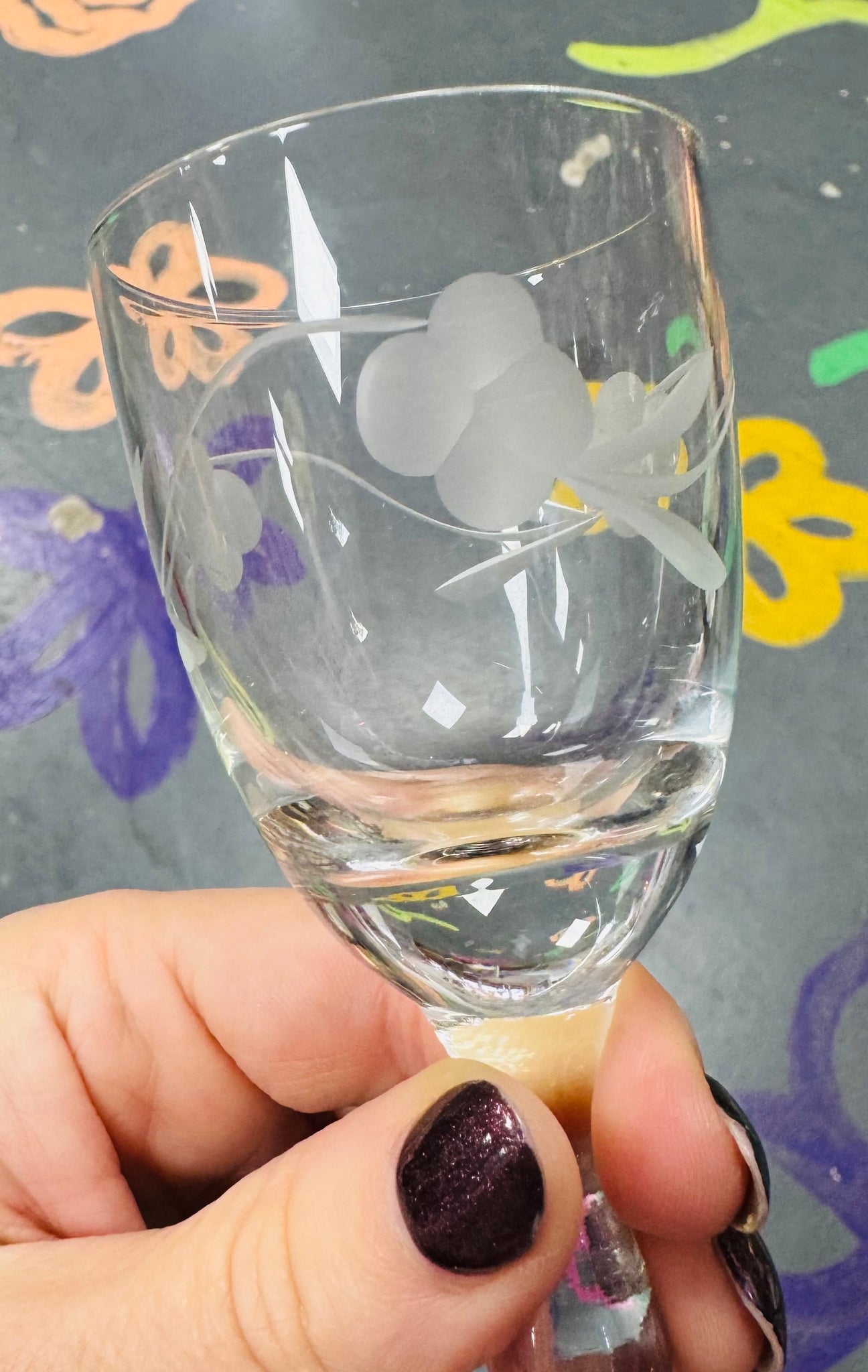 Set o 6 wydrau sherry Vintage wedi eu ysgythru / Set of 6 of Vintage etched sherry glasses