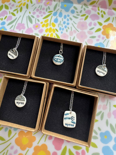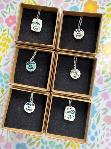 Mwclis unigryw ‘Am Byth’ seramig ac arian gan Tlysau / Unique seramic and silver ‘Am Byth’ necklace by Tlysau
