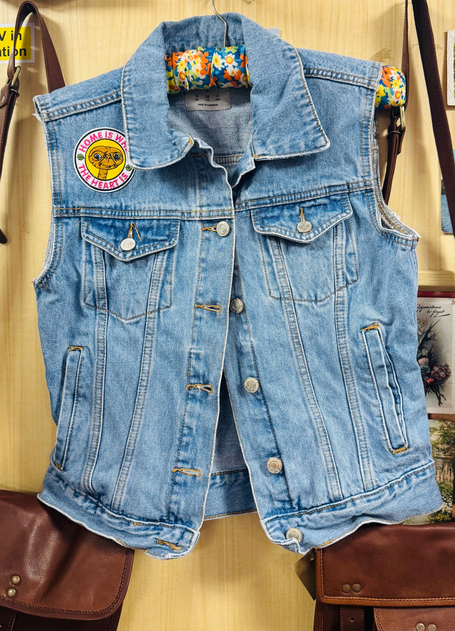 Gwasgod denim ail law maint 10 gyda patches lliwgar hwyliog (ET) / Second hand size 10 denim waistcoat with colourful fun patches (ET)