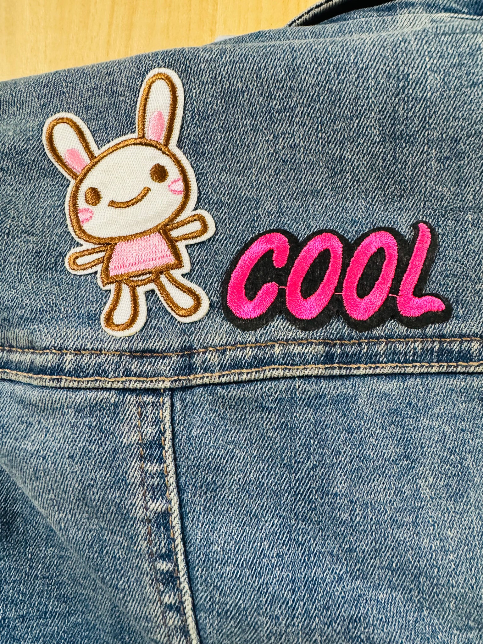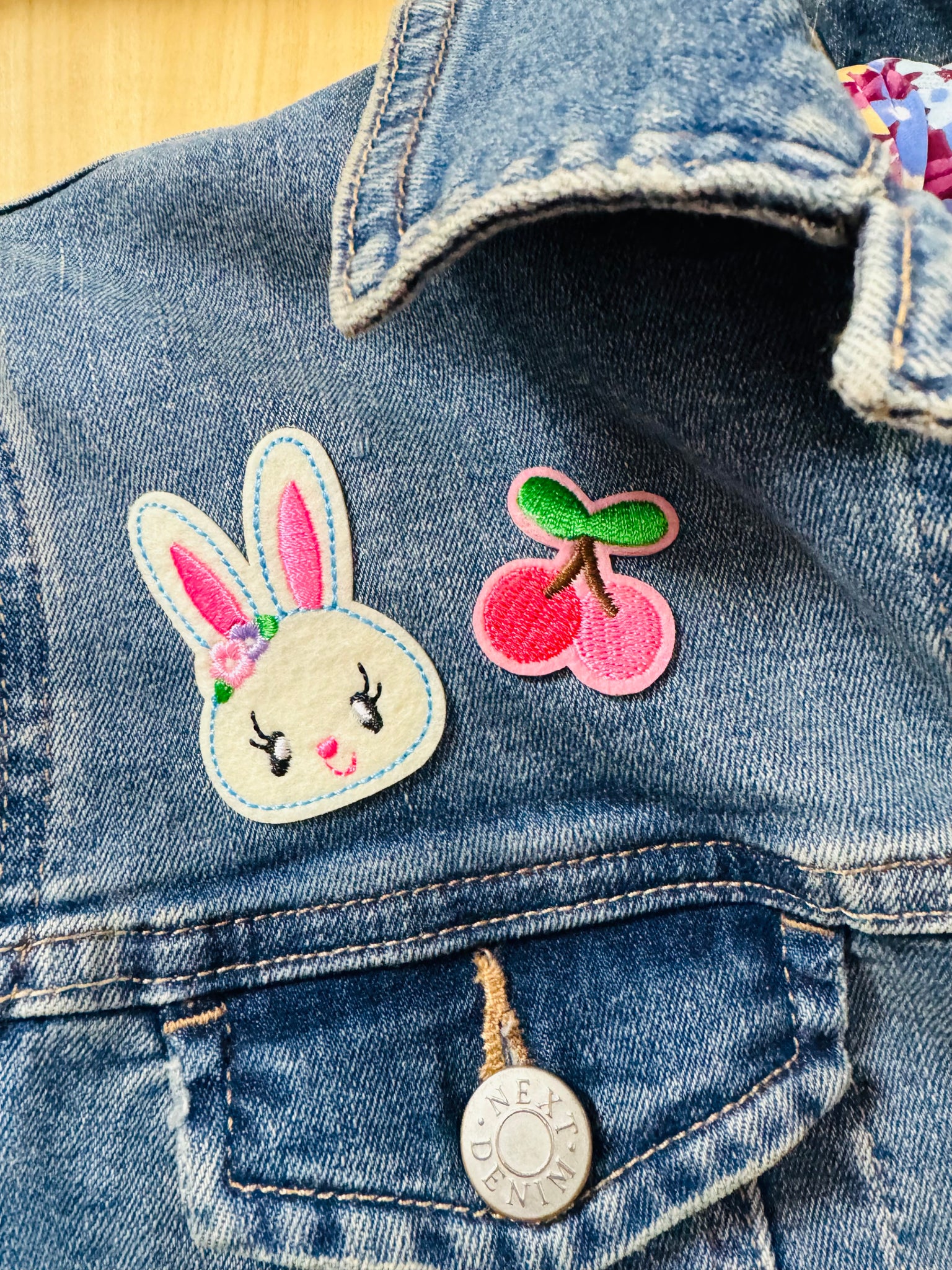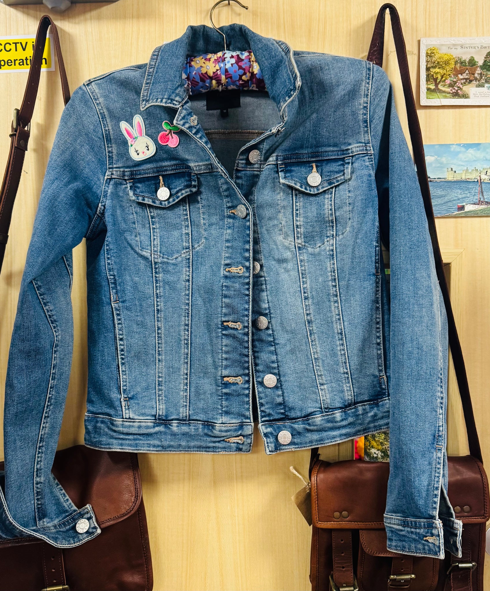 Siaced denim ail law maint 10 gyda patches lliwgar hwyliog / Second hand size 10 denim jacket with colourful fun patches
